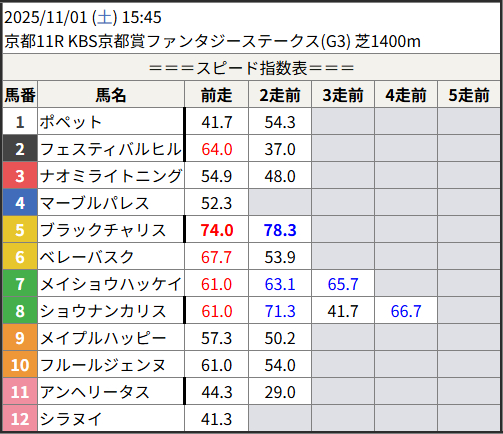 <スピード指数表について> ・中央・地方で同軸で比較できる指数です ・走破タイムを元に、斤量・ペースにて補正をかけた指数 ・灰色は条件が異なる場合 今回のレースが芝で、過去走がダートの場合 今回のレースがダートで、過去走が芝の場合 その他、出走取消・中止等の場合 ・「*」は中央・地方が異なる場合 今回のレースが中央で、過去走が地方の場合 今回のレースが地方で、過去走が中央の場合