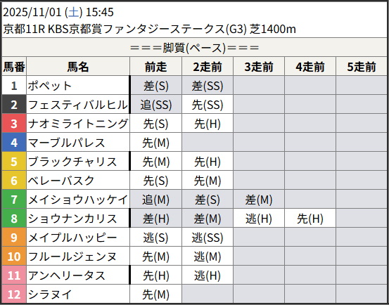 【馬場について】 京都2R芝1200mの勝ち時計が1:09.9。このタイム自体は未勝利クラスの水準だが、若干メンバーのレベルが低く時計は遅かった。「稍重」とは言え、1秒以上時計の掛かる馬場という訳ではなく、Bコース替わりもあって水準から少し速い時計の出る馬場だろう。この馬場なら恐らく決着時計は1分20秒台後半から21秒台前半での決着。