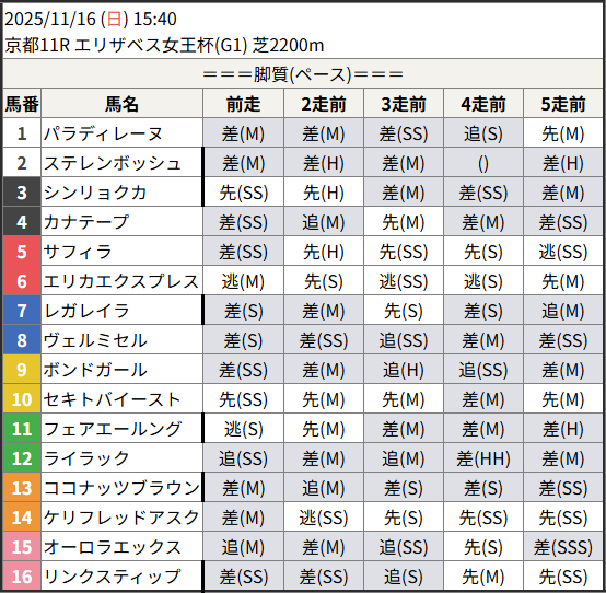 前に行く馬は少ない組み合わせ。ただ、前に行くエリカエクスプレスはスローに落としすぎるとダメなので、ある程度のペース。秋華賞の1000m59秒4だったので、これと同じか、距離が200m長い分これよりも少し遅いか。この前に行きながらも遅いペースではダメというのは、10.セキトバイーストも同じで、ローズS3着・都大路S1着・府中牝馬S1着、これはいずれも平均ペースの先行策での好走。前走のアイルランドTはスローで力を発揮できず、秋華賞は平均より速いペースでの逃げでそれぞれ10着と13着。平均ペースぐらいじゃないとダメなので、前に行く馬が少ないとは行っても、平均ペースぐらいでは流れる展開。