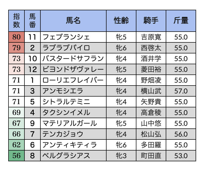 アンモシエラ・タクシンイメル・バスタードサフラン・フェブランシェと逃げた上で厳しいペースでも前残りできるという特性を持った馬が並んだ今回はその馬が逃げるか分からず、逃げた馬は残るが逃げれなかった馬や外を回る競馬になった馬は止まりそう。ここはノンプレッシャーで自分の差す競馬ができるテンカジョウを信頼し、相手にもビヨンドザヴァレーを選択。